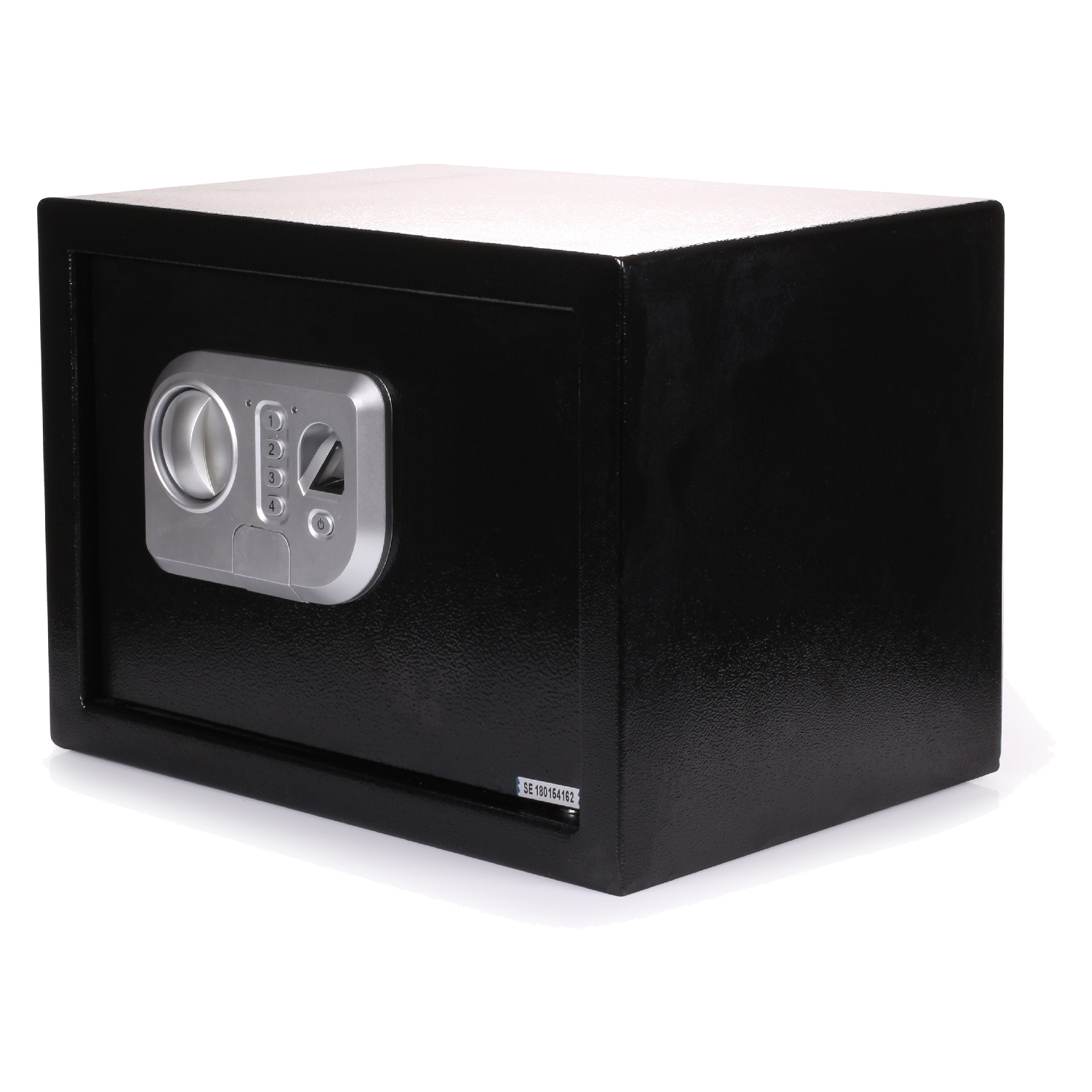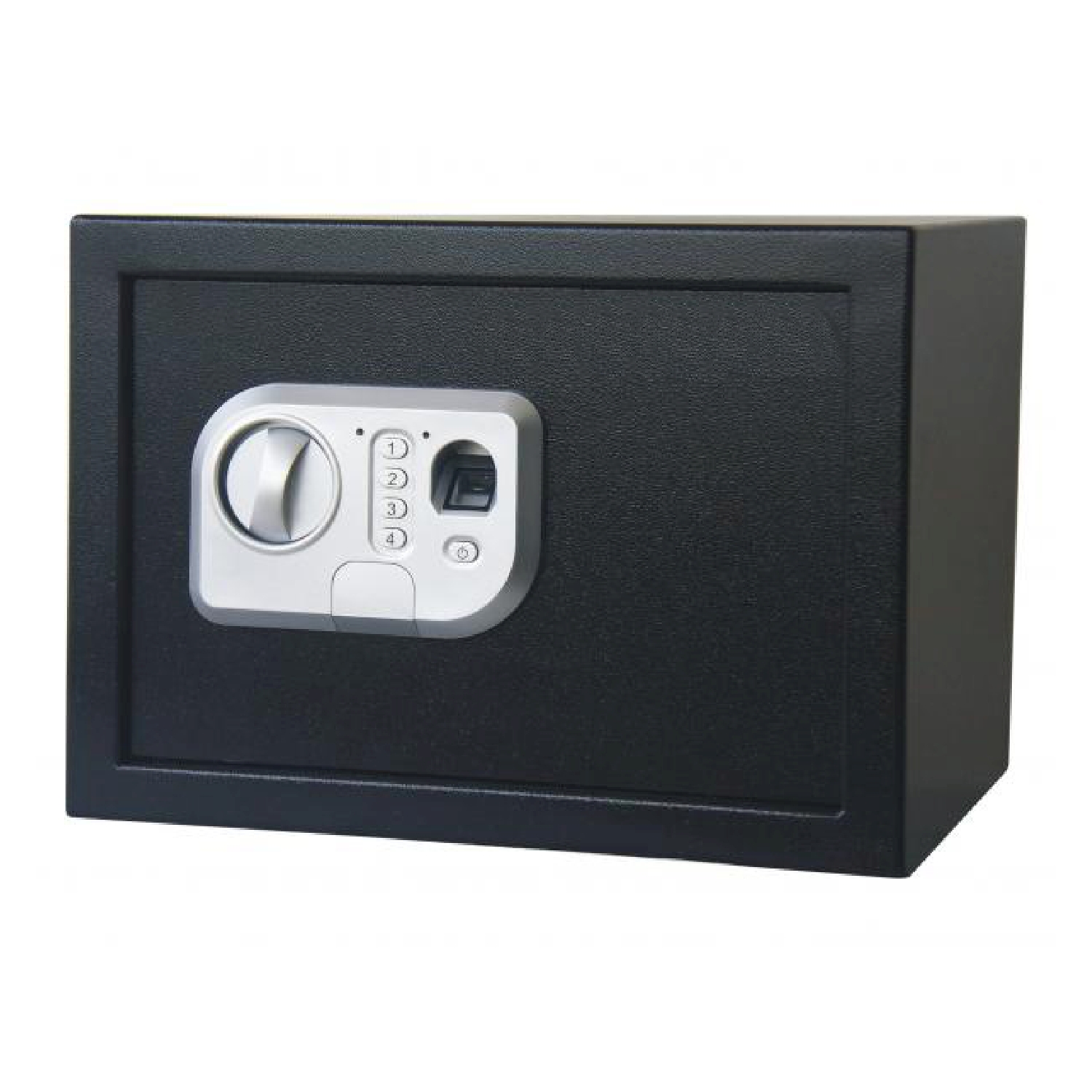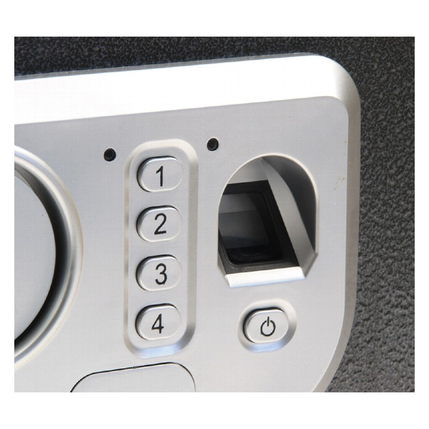 Der Tresor Opticum ECLIPSE ist eine Ideale Lösung zum Schutz gegen Diebstahl Ihrer Wertsachen. Der gehärtete Stahl macht ein Aufbrechen so gut wie unmöglich. Die 5 mm starke Türe wird mit zwei Schließbolzen von je 20 mm Durchmesser gesichert. Der Innenbereich ist unterteilt in zwei Fächern die jeweils mit einer Bodenschutzmatte ausgestattet ist. Die Montage des Safes kann auf dem Boden oder an der Wand erfolgen. Um den Schließmechanismus des Safes zu öffnen reicht es völlig aus, seinen Finger auf den Fingerprintsensor zu legen. Sie können bei der Erstinbetriebnahme bis zu 20 Fingerabdrücke speichern. Unabhängig davon, kann der Tresor auch mit einem 4-8 stelligen Code geöffnet werden, den Sie beliebig vergeben können. Die Tür selbst wird mit einem Drehknopf geöffnet. Zwei Farb-LEDs machen Sie immer darauf aufmerksam, ob der Tresor geöffnet (grüne LED) oder geschlossen ist (rote LED).