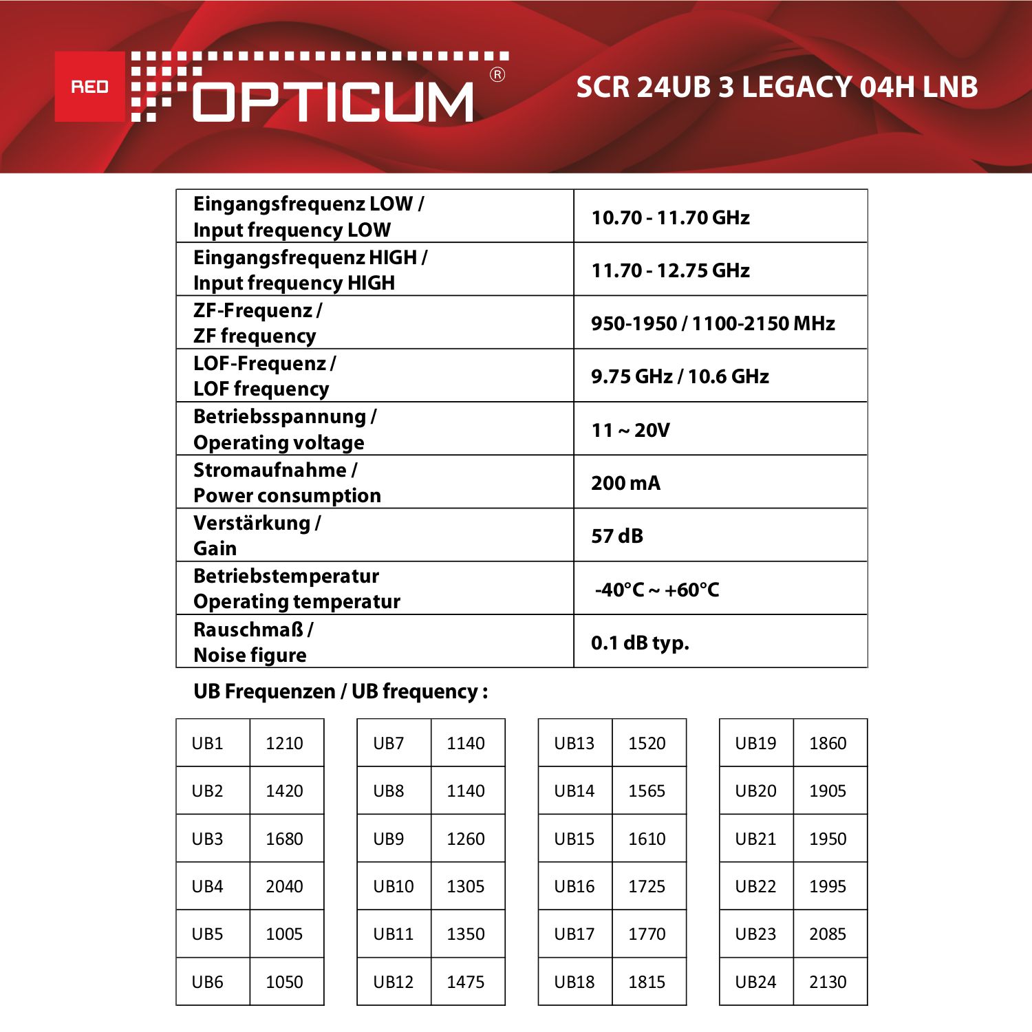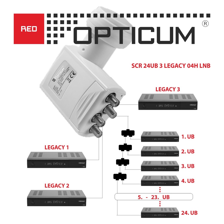 Mit diesem SCR-LNB (Einkabel-LNB) erhalten Sie die Möglichkeit 24 Teilnehmer über nur ein Koaxkabel (Receiver müssen über Einkabelfunktion verfügen) und zusätzlich 3 Teilnehmer (auch ohne Einkabellösungsfunktion) direkt über die Legacy-Ausgänge zu versorgen. Zur Steuerung der SCR Einkabellösung müssen die angeschlossenen Satellitenreceiver das Satellite Channel Routing (SCR/CSS-Steuerbefehlen nach EN50494/EN50607) bzw. den Unicable Befehlssatz unterstützen. Der Konverter kann kann für verschiedene Satelliten, wie für Astra, Hotbird, Eutelsat, Türksat, etc. eingesetzt werden. Das LNB stellt für die Einkabellösung 24 verschiedene umgesetzte Ausgangsfrequenzen zur Verfügung. Dabei stehen sämtlichen Teilnehmern alle Programme sowie das gesamte Frequenzspektrum eines Satelliten zur Verfügung. Das LNB besitzt eine herausziehbare Wetterschutzkappe zum Schutz Ihrer Anschlüsse. Das Gehäuse ist extrem hitze- und kältebeständig.