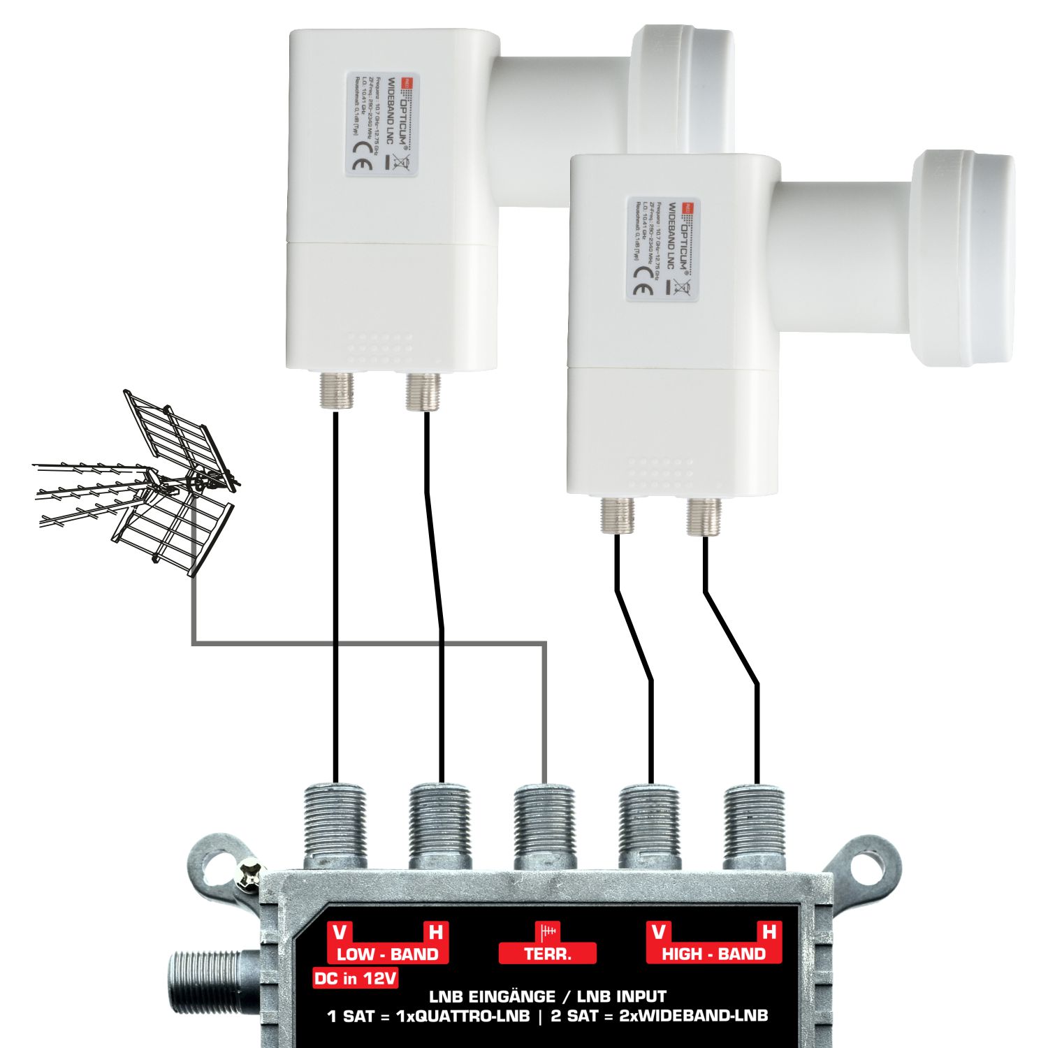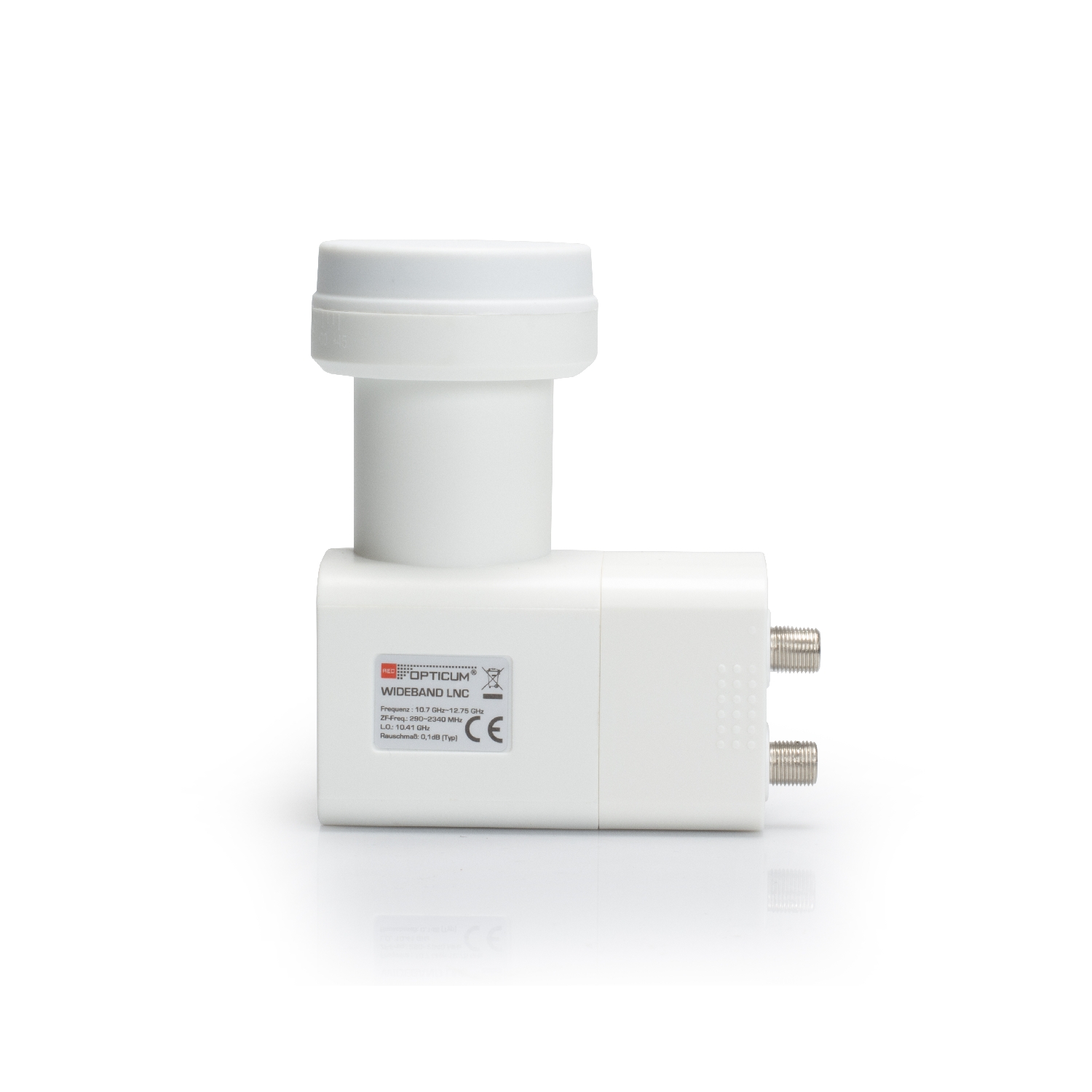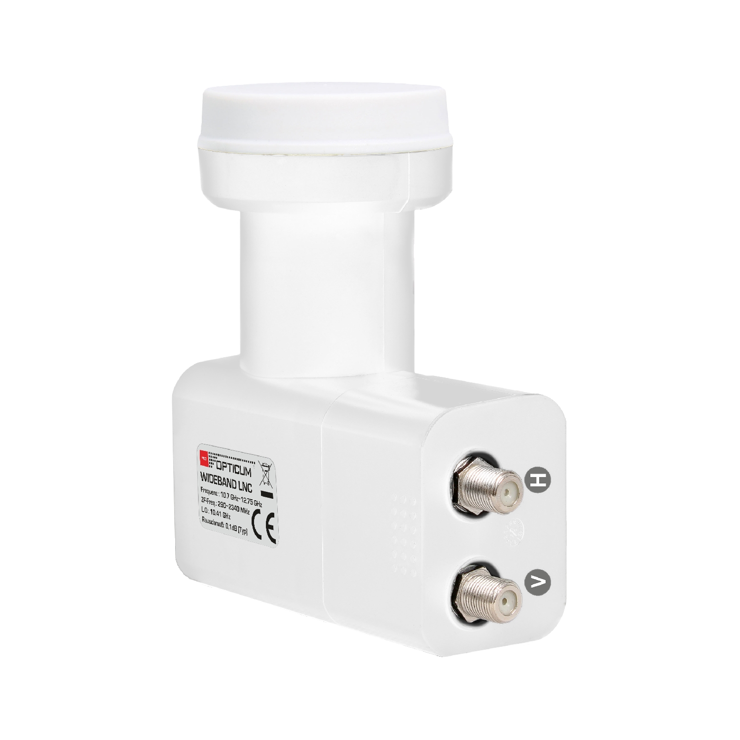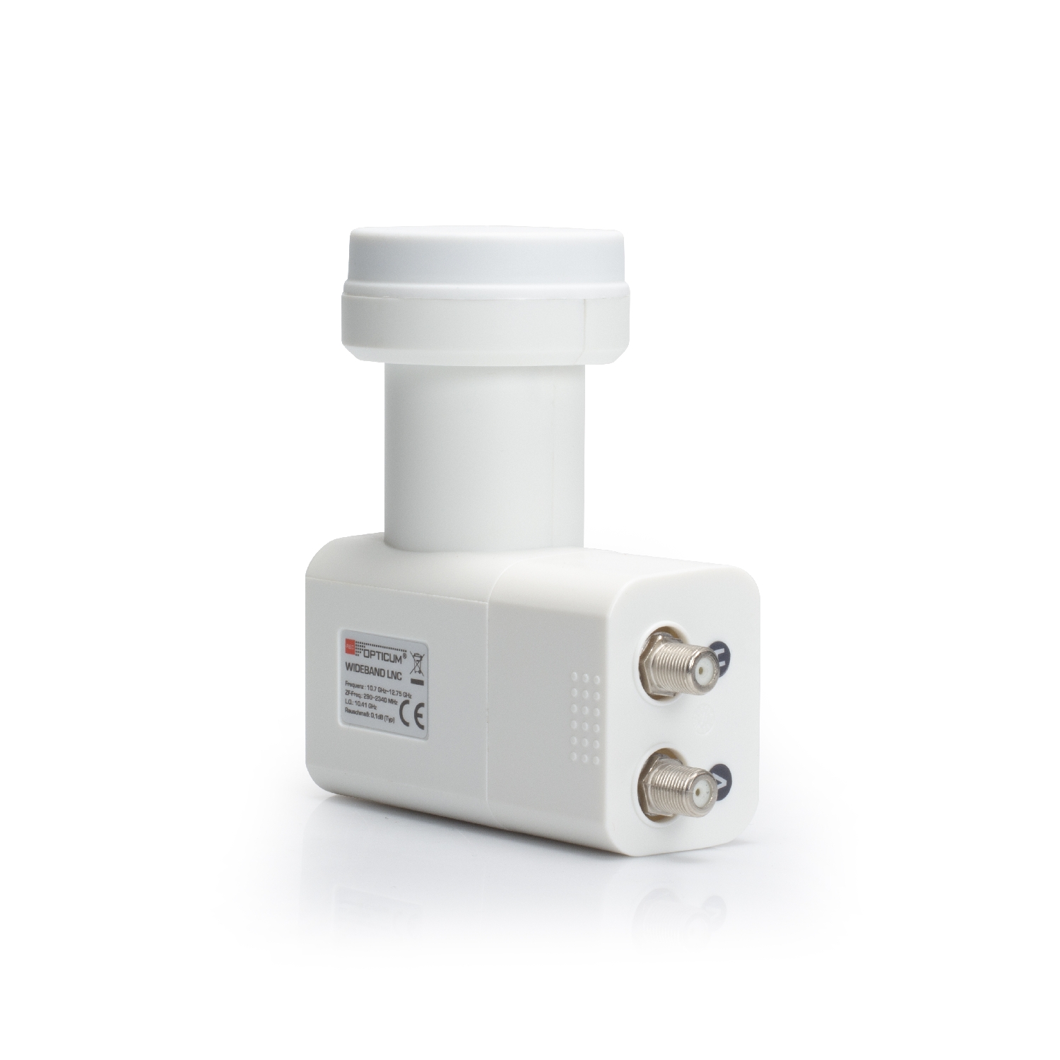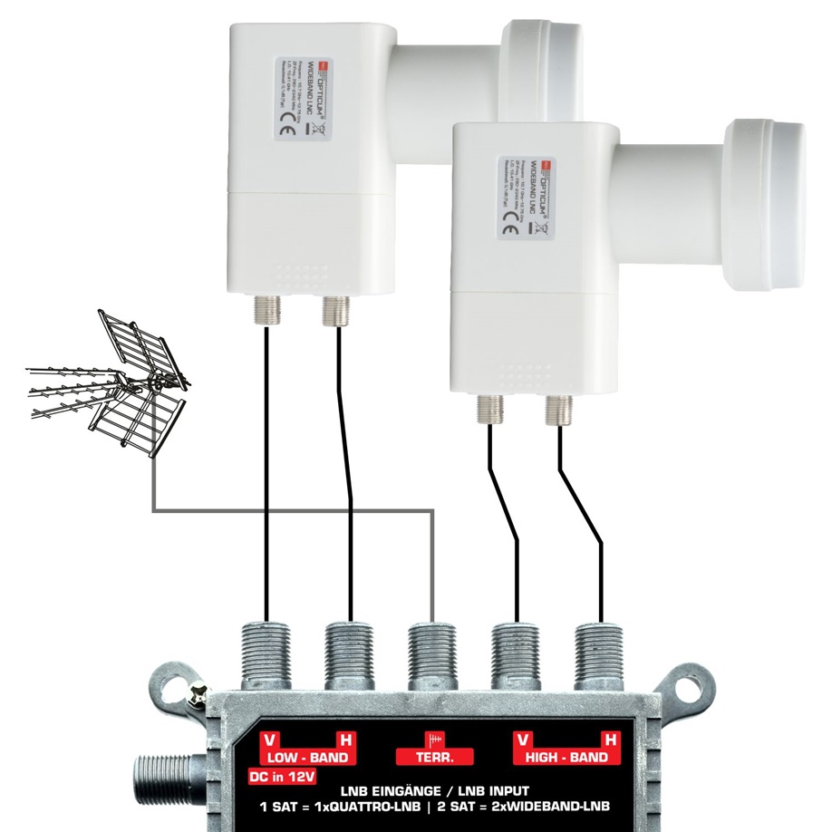 Dieses Wideband LNB ist speziell für Einkabellösungsanlagen entwickelt. Statt der bisherigen vier einzelnen Ebenen (HH/HL/VH/VL) werden hier nur noch zwei Ausgänge benötigt. Das LNB besitzt 2 Ausgänge (vertikal & horizontal) und das gesamte, empfangene Satellitensignal (10,7-12,75 GHz) wird mit einer Oszilatorfrequenz von 10,41 GHz auf den Ausgangsfrequenzbereich von 290-2340 MHz umgesetzt. Wideband LNCs werden überwiegend in SCR/ dCSS Multischalteranlagen eingesetzt. Pro Satellit werden somit nur noch zwei Ableitungen zum Multischalter benötigt. Voraussetzung sind Multischalter mit entsprechenden Wideband-Eingängen (z.B. Opticum dCSS 52-32). Das Wetterschutzgehäuse mit 40 mm Feeddurchmesser besitzt einen ausziehbaren Wetterschutz für den witterungsbeständigen Anschluss Ihrer F-Stecker Das Gehäuse ist extrem hitze- und kältebeständig.