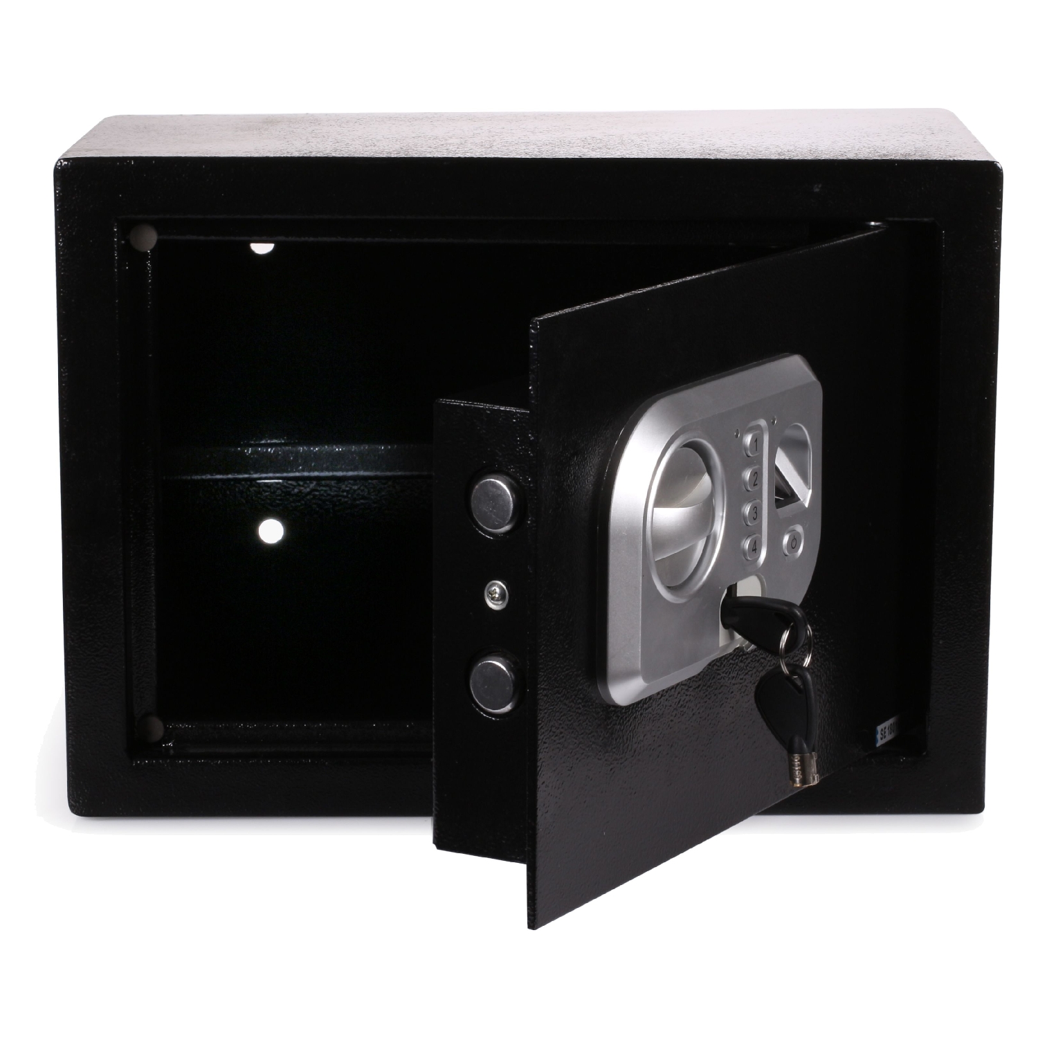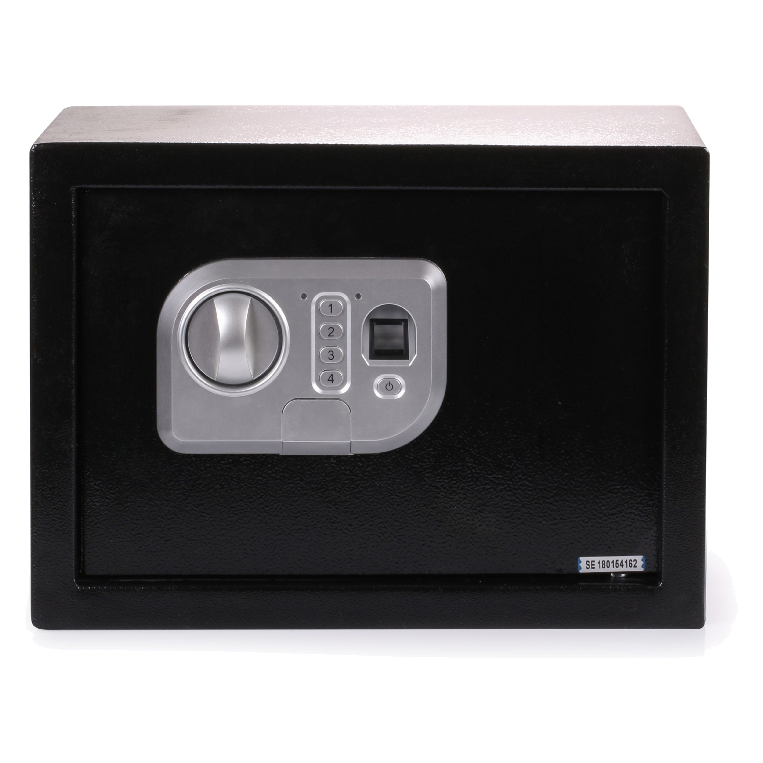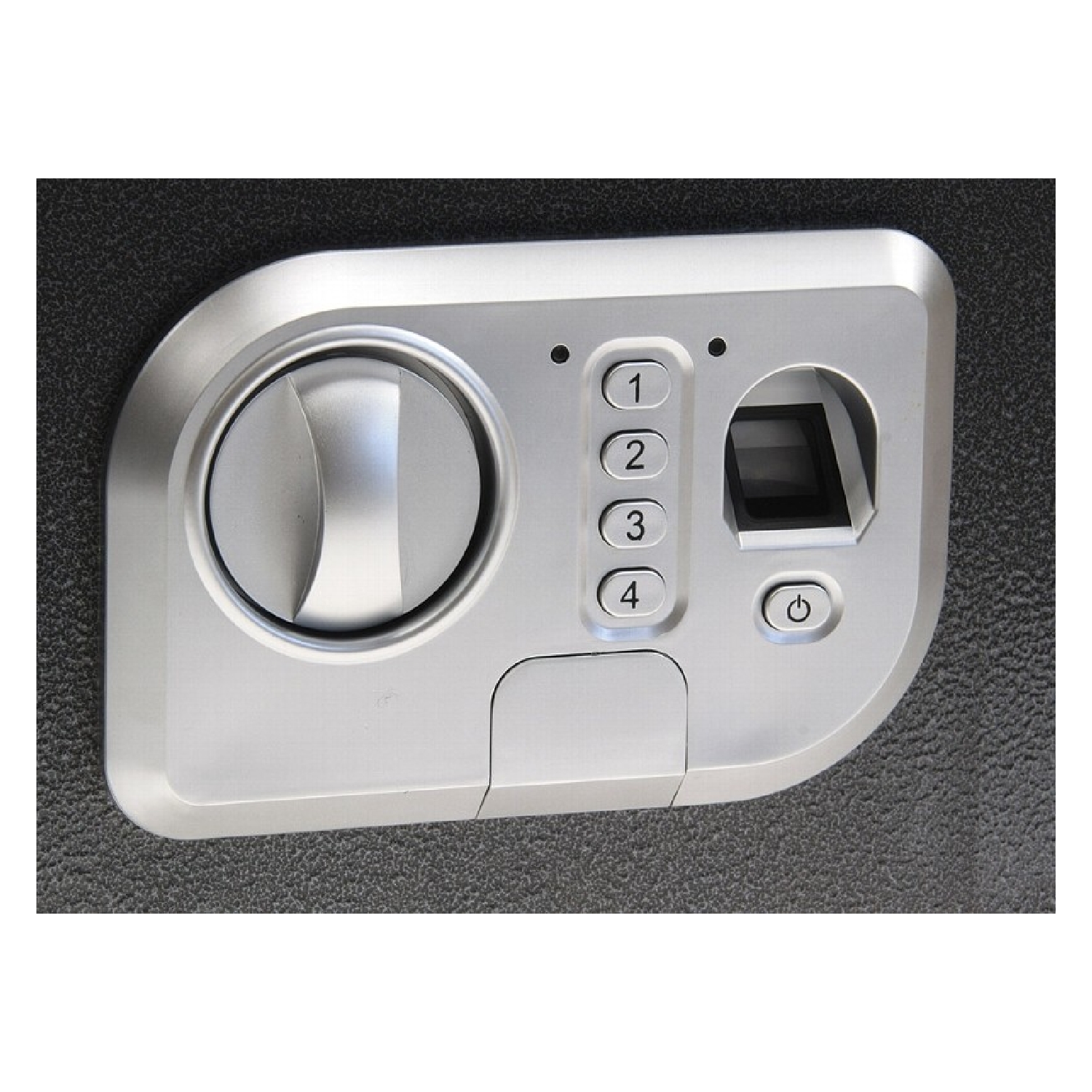 Der Tresor Opticum ECLIPSE ist eine Ideale Lösung zum Schutz gegen Diebstahl Ihrer Wertsachen. Der gehärtete Stahl macht ein Aufbrechen so gut wie unmöglich. Die 5 mm starke Türe wird mit zwei Schließbolzen von je 20 mm Durchmesser gesichert. Der Innenbereich ist unterteilt in zwei Fächern die jeweils mit einer Bodenschutzmatte ausgestattet ist. Die Montage des Safes kann auf dem Boden oder an der Wand erfolgen. Um den Schließmechanismus des Safes zu öffnen reicht es völlig aus, seinen Finger auf den Fingerprintsensor zu legen. Sie können bei der Erstinbetriebnahme bis zu 20 Fingerabdrücke speichern. Unabhängig davon, kann der Tresor auch mit einem 4-8 stelligen Code geöffnet werden, den Sie beliebig vergeben können. Die Tür selbst wird mit einem Drehknopf geöffnet. Zwei Farb-LEDs machen Sie immer darauf aufmerksam, ob der Tresor geöffnet (grüne LED) oder geschlossen ist (rote LED).