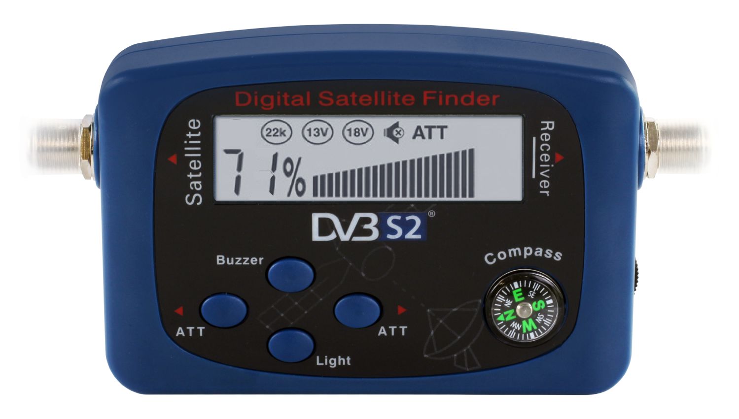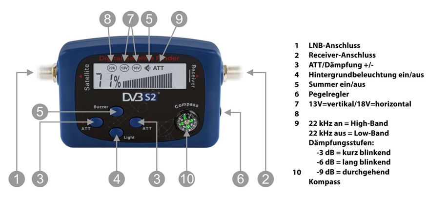 Digitales Messgerät der neusten Generation zur Justierung Ihrer Satelliten-Antenne. Der mikroprozessorgesteuerte Satfinder Opticum OPS-2 ermöglicht es Ihnen Ihre Sat-Anlage schnell präzise auszurichten. Dafür stehen Ihnen die Digital-Anzeige und ein akustisches Signal zur Verfügung. Dieses Gerät ist sehr empfindlich und kann auch schwächste Signale erkennen. Starke Eingangssignale (durch leistungsfähige Satelliten oder große Satellitenantennen) können mit den "Dämpfung +/" Tasten und dem seitlichen Einstellrad problemlos abgeschwächt werden. Dies ermöglicht ein optimales Auslesen und Einrichten verschiedenster Sat-Anlagen. Der Satfinder wird durch den Receiver/TV oder Multischalter mit Spannung versorgt und benötigt kein zusätzliches Netzteil.