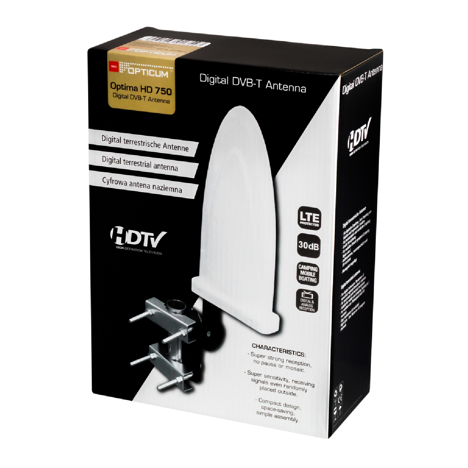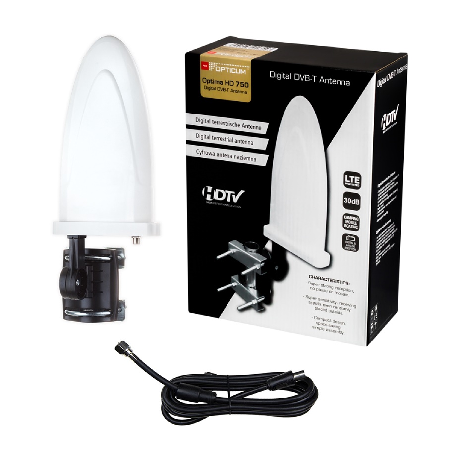 Diese aktive DVB-T2/DAB/DAB+/UKW-Antenne eignet sich bestens für den Empfang digitaler terrestrischer Signale für zu Hause, Kleingärten/Wohnwagen oder für Unterwegs. Die Opticum OPTIMA HD 750 Antenne hat ein gegen UV-Strahlen beständiges Gehäuse und ist gleichzeitig wasserabweisend, so dass diese innen und außen eingesetzt werden kann. Die Antenne liefert eine 30 dB Verstärkung durch Aktivierung der 5V Schaltspannung über Ihren DVB-T2 Receiver.