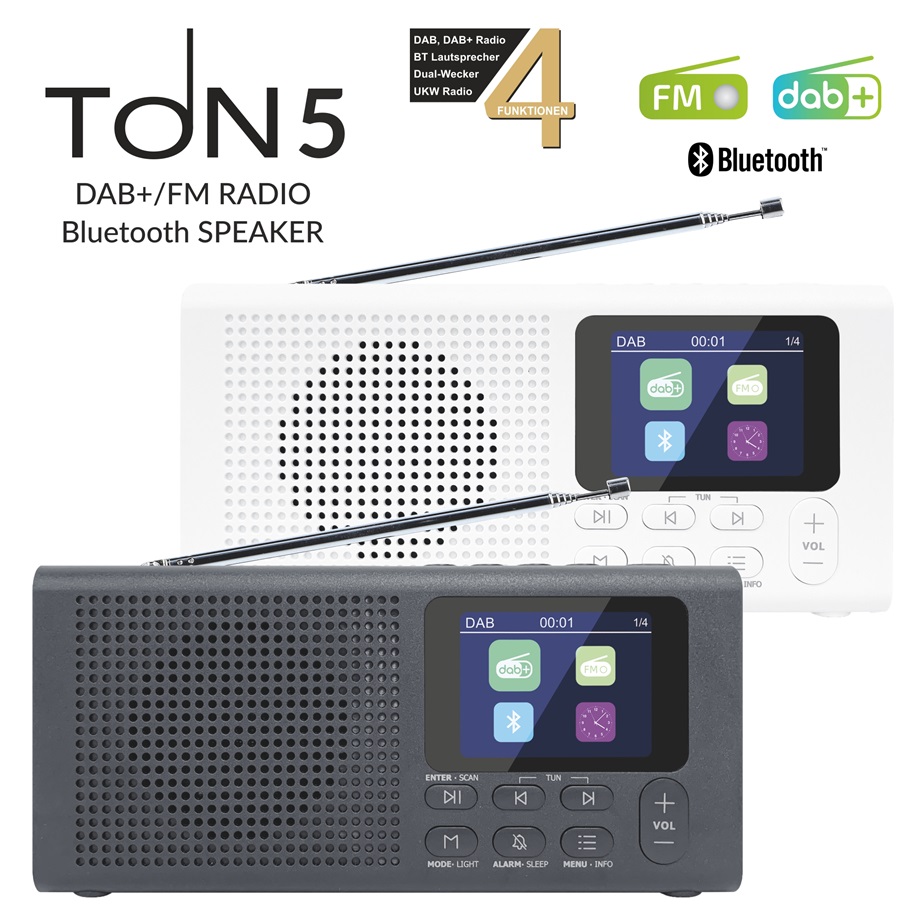 Das OPTICUM TON 5 Radio bietet moderne und benutzerfreundliche Funktionen (FM/DAB+/BLUETOOTH). Das DAB+ Radio OPTICUM TON5 sorgt mit seinem kristallklaren, rauschfreien Empfang und vielen nützlichen Funktionen für ein neues Highlight in der Opticum Produktreihe. Das tragbare Gerät ist ideal für den Heimbereich oder unterwegs und kann mit 4 x AA Mignonbatterien (nicht inkl.) oder per Strom betrieben werden. Ein USB-C Kabel liegt der Lieferuzng bei. (Netzteil nicht inkl.). Dank der großen DAB+ Programmvielfalt können Sie so zu Hause wie auch unterwegs Ihre Lieblingssender genießen. Streamen Sie via Bluetooth Ihre selbst zusammengestellten Playlists von Ihrem Smartphone, Tablet und Notebook über Ihr TON5 Radio. Zahlreiche Funktionen, wie FM-Radio, DAB-Radio, DAB+ Radio, Bluetooth, 2 Weckzeiten, Einschlaffunktion, ein 3.5mm-Kopfhöreranschluss, sowie ein 2.4" Farb-TFT Display runden das Paket ab. Das Systemmenü ist einfach und intuitiv bedienbar und kann außer in deutsch noch in vielen anderen Sprachen angezeigt werden. Das Gerät besitzt an der Oberseite 4 Favoritentasten, auf denen sich Ihre Lieblingssender speichern und direkt abrufen lassen. Das TON5 glänzt darüber hinaus mit einem schlichten, modernen Design sowie, vor allem in Anbetracht der kleinen Abmaße, beeindruckenden Klang und ausreichend Leistung.
